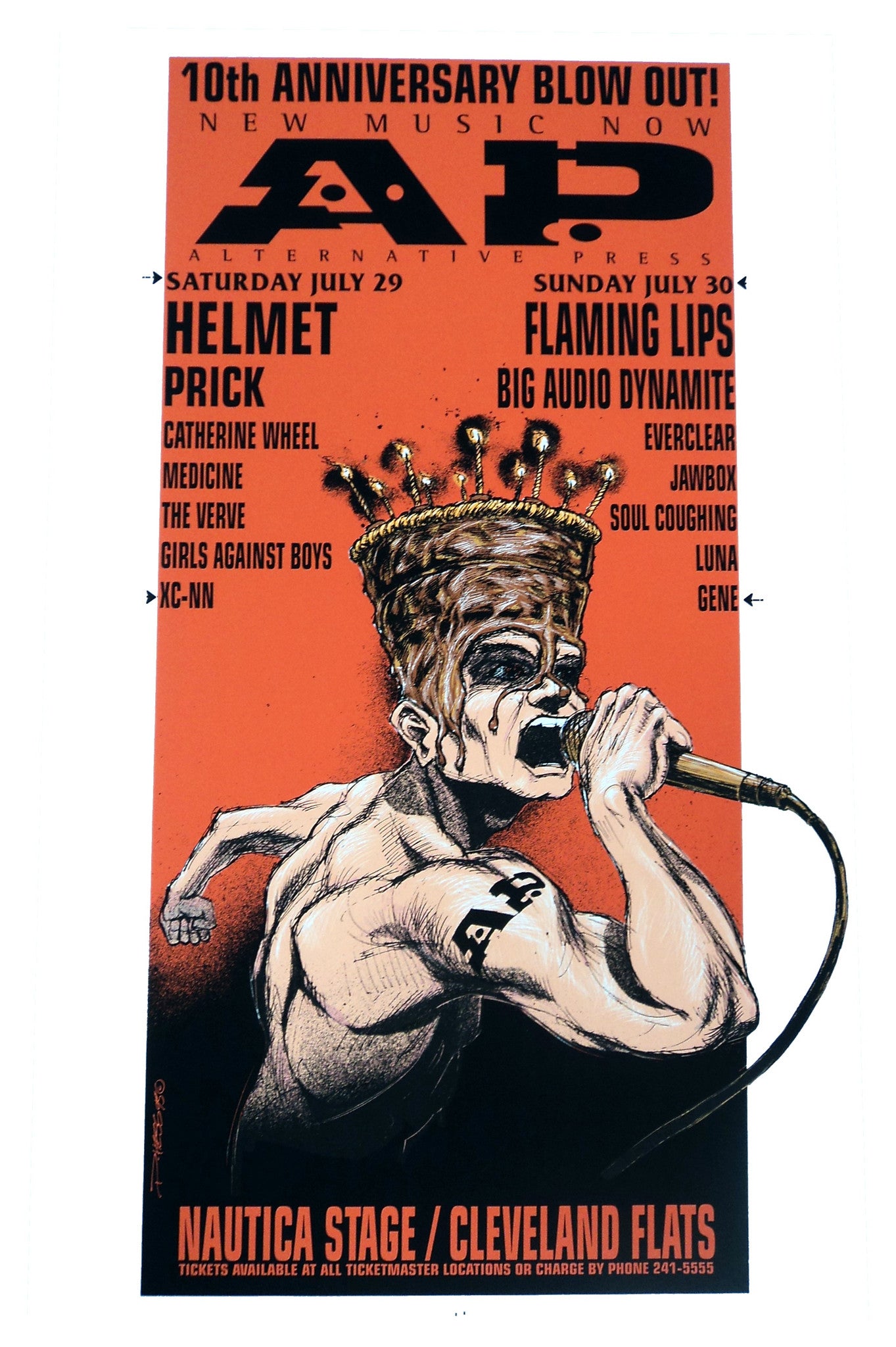 AP 10th Anniversary 5 color serigraph, 20 1/2 x 33in, edition of 450 Bands: Big Audio Dynamite , Everclear , Flaming Lips , Girls Against Boys , Helmet , Jawbox , Luna , Prick , Soul Coughing , Verve, The , Weber, Catherine Event: Nautica Stage- Cleveland, OH 7/29-30/95